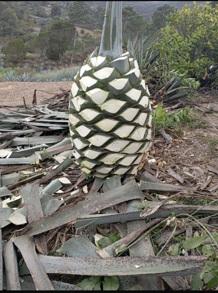 Cuando madura el maguey, se dice que esta sazón, se cortan las pencas para dejar solo la piña (corazón). Los jimadores cortan las pencas con coa y machete para dejar expuesta la piña, corazón que puede pesar entre 25 y más de 100 kg, y se trasladan a hornos o palenques.3. Cocción